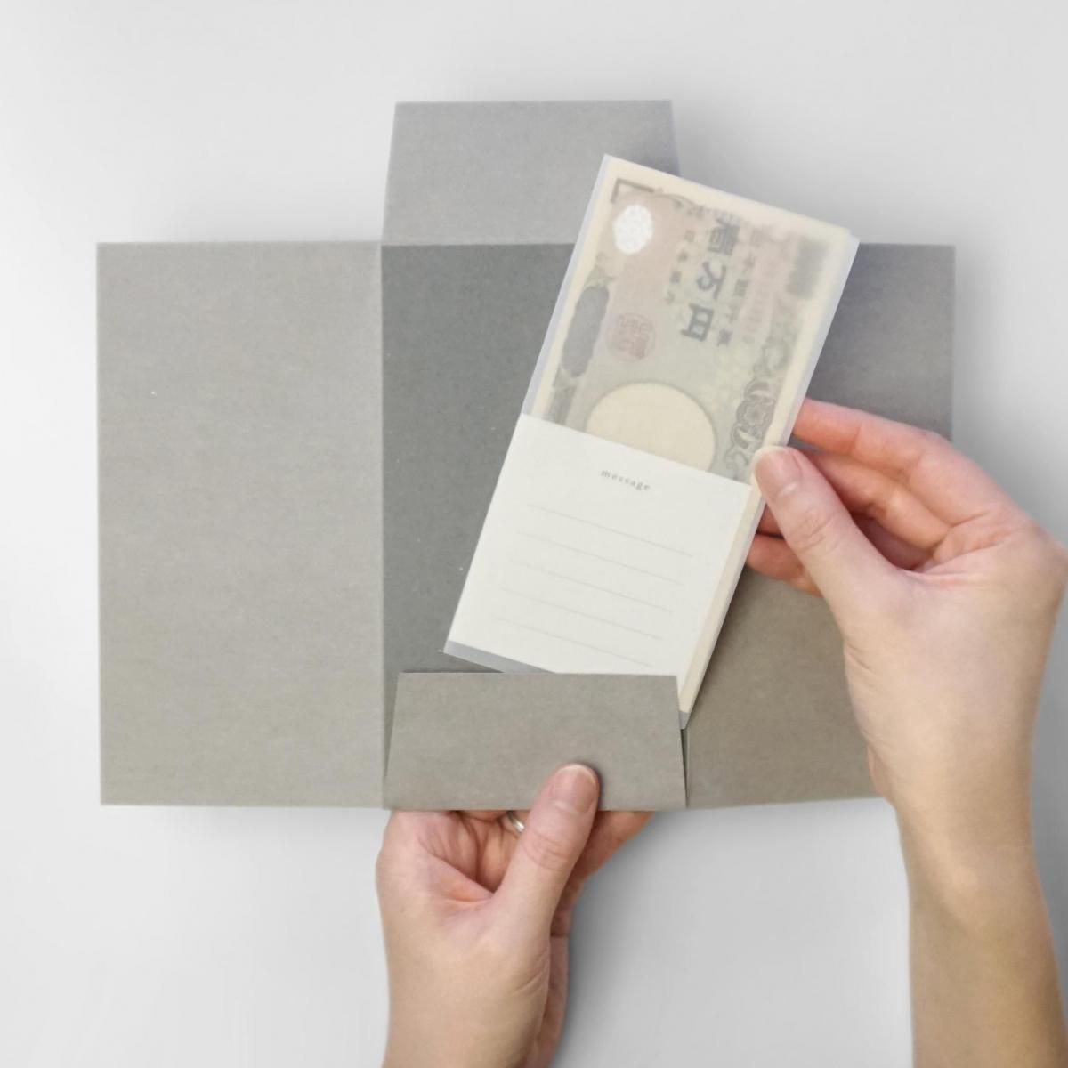 お金を出し入れする方法は、一般的な祝儀袋に比べとても簡単です。祝儀袋を十字型に展開し、中央にお金を置き、下上左右と畳んでお包み下さい。