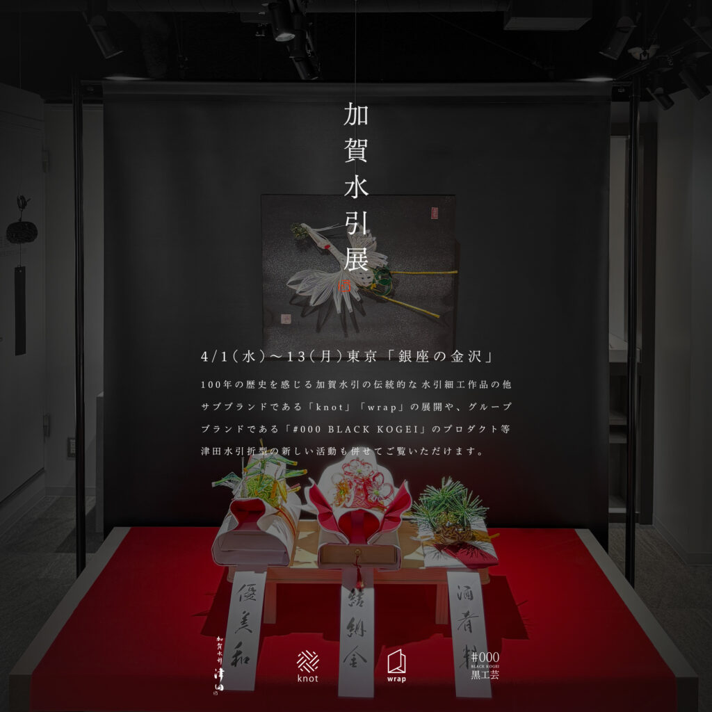 今年も「銀座の金沢」にて加賀水引展 2026 を開催致します。100年の歴史を感じる加賀水引の伝統的な水引細工作品の他、サブブランドである「knot」「wrap」の展開や、グループブランドである「#000 BLACK KOGEI」のプロダクト展開など、津田水引折型の新しい活動も併せてご覧いただけます。また、水引細工のワークショップも期間中2日間開催致します。今年は水引細工の風鈴の制作を予定しております。講師:加賀水引 5代 津田六佑。参加費 6,600円(税込)。